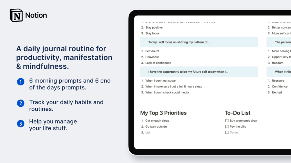 - A Self-Reflection journal with 6 prompts in the morning and 6 prompts at the night.
